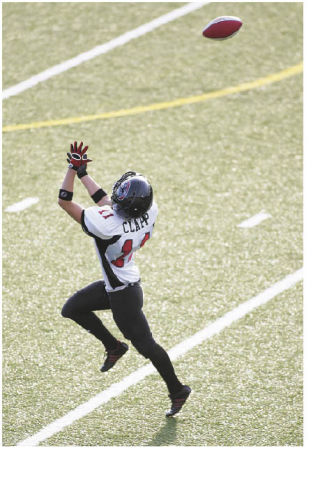 Wide receiver Karlene Clapp of Kent reaches to catch a pass during a Seattle Majestics practice last Thursday at French Field. As the state’s only all-women tackle football team