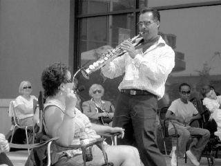 Darren Motamedy serenades Barbara Henderson Aug. 12 during one of the free Soulful Sounds of Summer concerts at Kent Station. Motamedy and his band entertained the crowd with songs from his new album “Don’t Cha’ Know.”