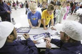 According to teacher Robyn Enders who set up the players’ visit, the idea was to try and spark interest in literacy night among the older students, especially the boys, many of whom did not turn out for last year’s event.
