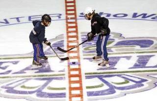 Seattle Thunderbirds Assistant Turner Stevenson allowed his children Jakob, 8, left, and Branden, 10, Dec. 26 to play on the new ice at the ShoWare Center in Kent before the Thunderbirds took to the ice for their first-ever practice there. The T-Birds’s first home game in Kent is Jan. 3 against the Everett Silvertips.