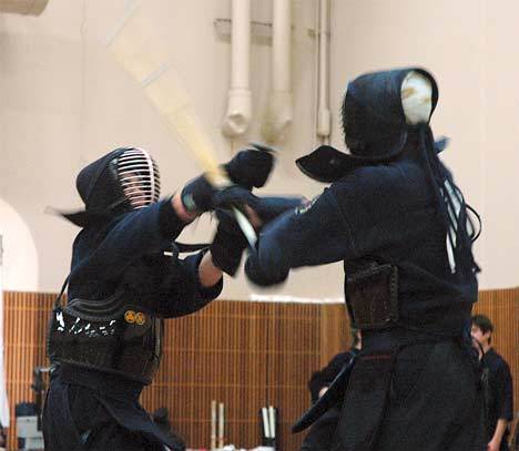 They swung their shinai (swords) with fervor, shouting with great kiai (spirit).