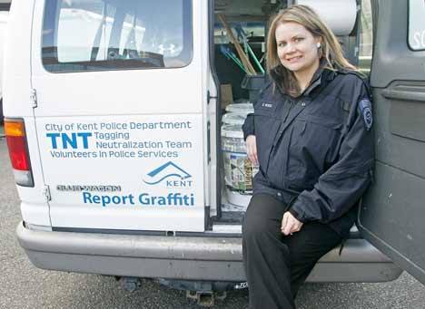 Kent Police Education Specialist Sara Wood works with officers to combat graffiti through organized cleanups and provides property crime-prevention tips to local businesses.