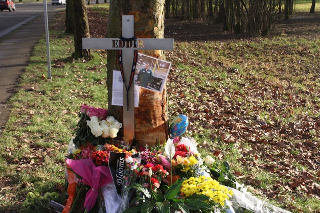 Friends ad co-workers set up a memorial of flowers Friday for Mariano at the base of the tree at the accident site. They also included a photo of Mariano at his job as a mechanical technician/specialist at Flow International Corp. The company is just north of the accident site.