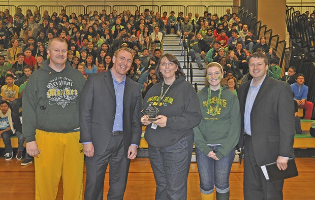 Meeker Middle School band teacher Carol Brewster is presented with the First Investors Outstanding Educator Award. From left: First Investment representative Will Turner; Principal Jeffery Pelzel; band teacher Carol Brewster; student Jenna Mcghie and Nick Rhodes
