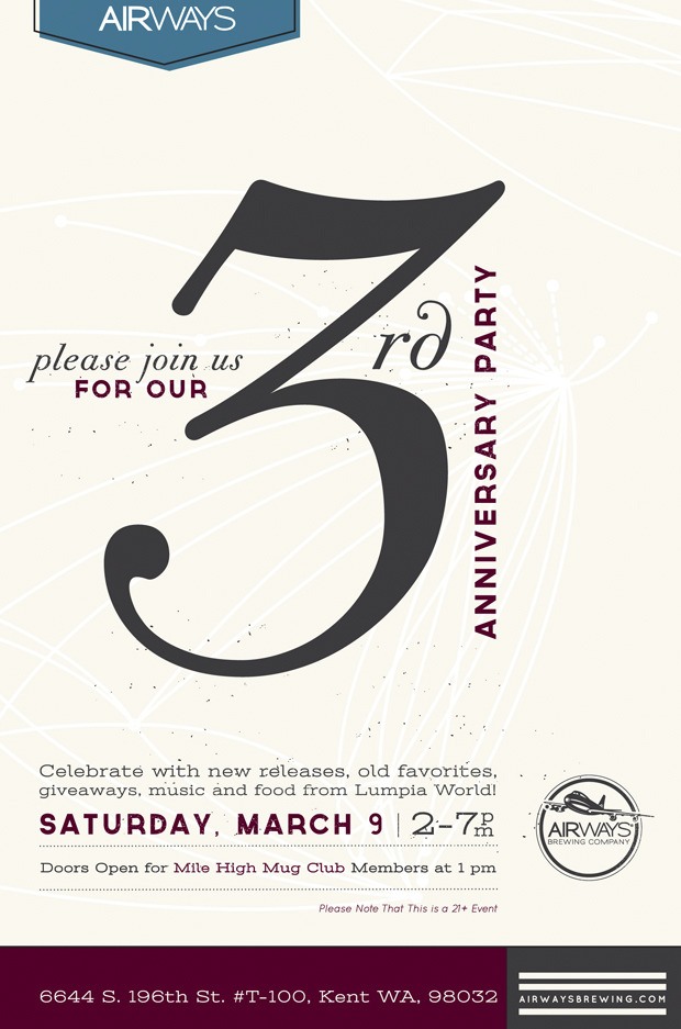 Airways Brewing celebrates three years of growth and expansion with a party – and several new releases – on Saturday, March 9.