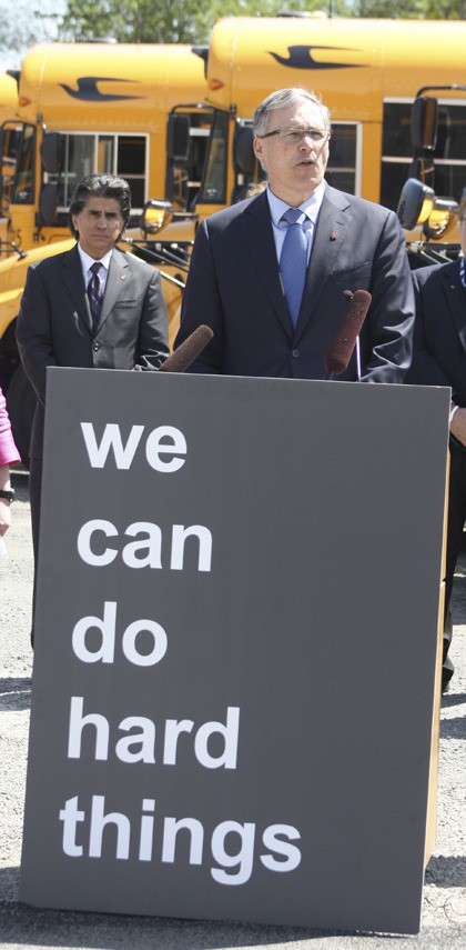 In front of a small crowd gathered outside the Highline Public Schools Transportation Facility in Burien, Inslee promoted his budget plan for schools. “We need a different route,” he said at the news conference.