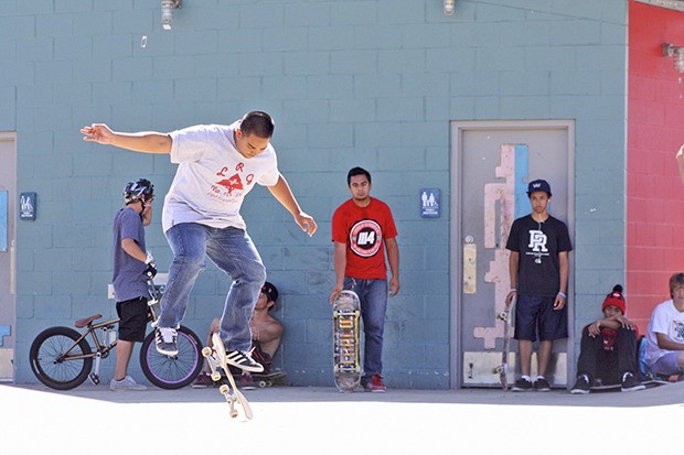 Ronnie Gerona performs a kickflip while his friends look on from a cooler position in the shade at Arbor Heights 360 Skate Park in Kent on Tuesday.