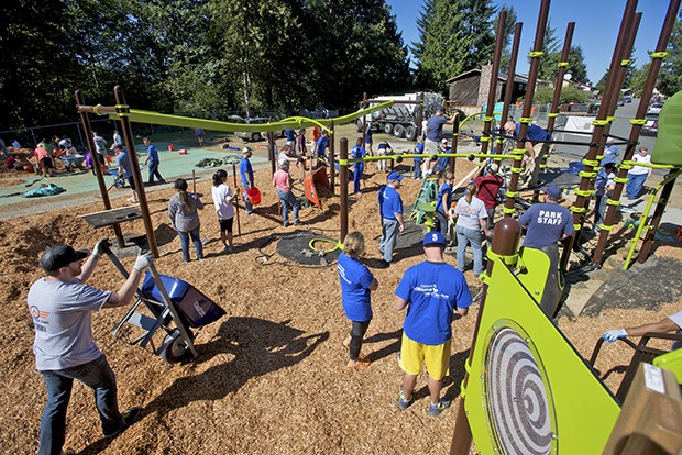 Roughly 50 volunteers descended on Kent’s Green Tree Park last Saturday to construct a new play structure for the neighborhood.