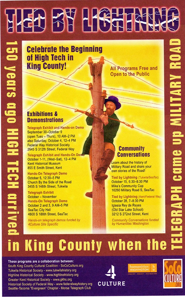 In October, with the assistance of 4Culture Historic Site(s) Specific funding, the sesquicentennial of the telegraph’s arrival will be marked with “Tied By Lightning” exhibits, free hands-on telegraph demonstrations, and other events along Military Road in South King County, as well as at 4Culture offices and the King County Courthouse.