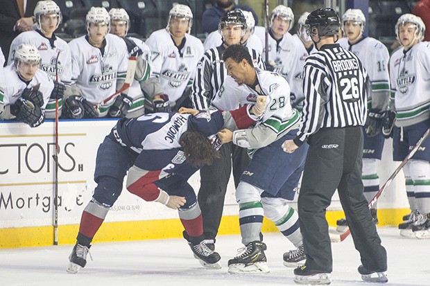 Second period – 2, Seattle, True 6 (Theodore, Eansor), 3:51 (pp). 3, Seattle, Millette 9 (Lipsbergs), 7:51. 4, Seattle, Volcan 5 (Elder, Millette), 13:29. Penalties – Vickerman, Tri-City (high-sticking), 2:32. Topping, Tri-City (goaltender interference), 4:08. Hamonic, Tri-City (roughing), 4:28. Kolesar, Seattle (roughing), 4:28. Hamonic, Tri-City (major-fighting), 10:45. Kolesar, Seattle (major-fighting), 10:45. Nejezchleb, Tri-City (slashing), 18:26.