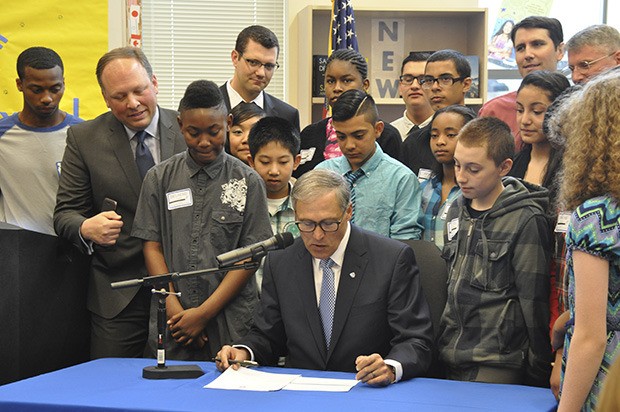 Gov. Jay Inslee visited Mill Creek Middle School on Tuesday to sign legislation that improves aspects of the College Bound program, including data collection, outreach and program outcomes.