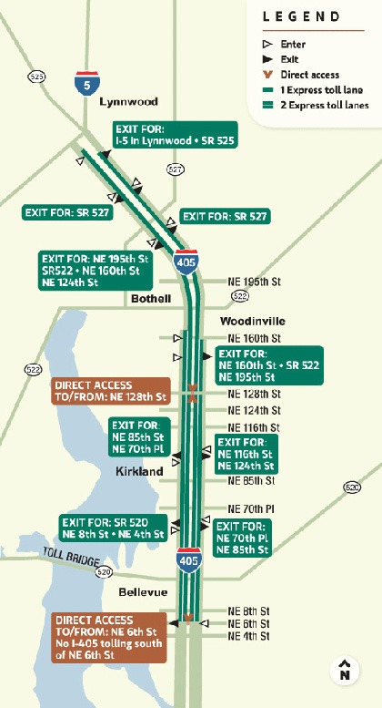 Express toll lanes will operate on a 17-mile stretch between Northeast Sixth Street in Bellevue and Interstate 5 in Lynnwood.