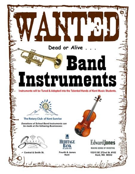 The Rotary Club of Kent Sunrise is collecting used musical instruments to give to disadvantaged students in the Kent School District.
