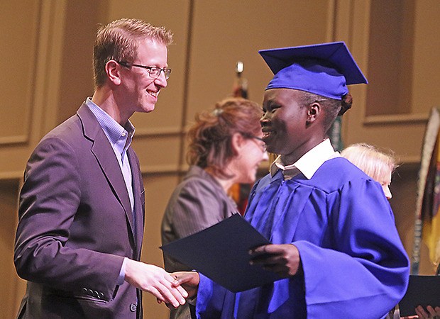 Cadet Mana Gach of Kent shakes hands with Congressman Derek Kilmer during commencement in Bremerton on Dec. 19.