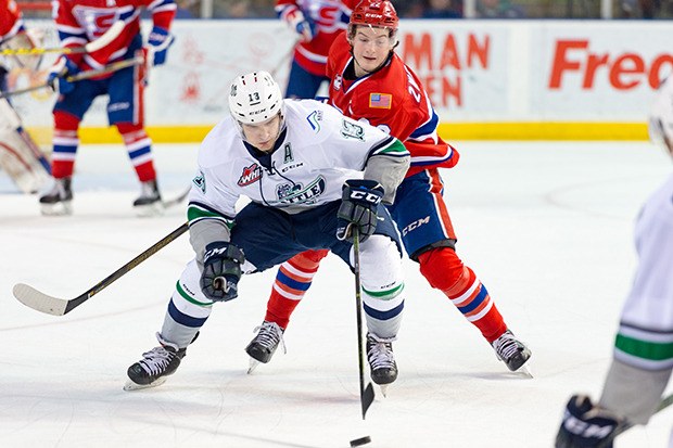 The Thunderbirds' Mathew Barzel takes the puck the other way with the Chiefs' Dominic Zwerger behind him.