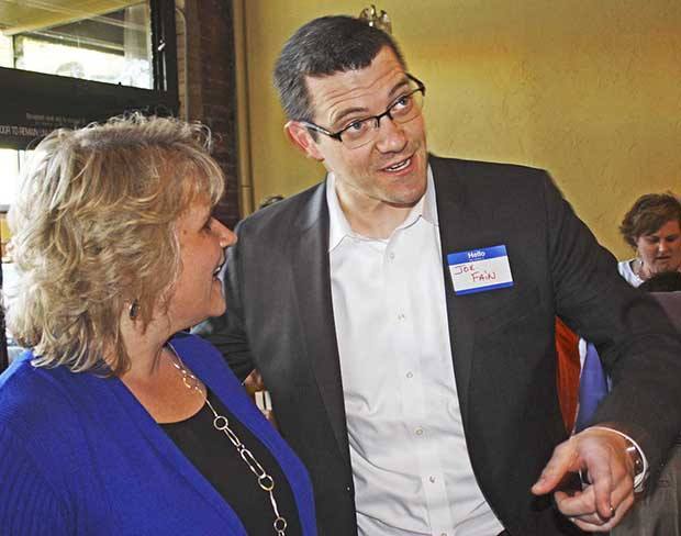 Kent mayoral candidate Dana Ralph chats with state Sen. Joe Fain