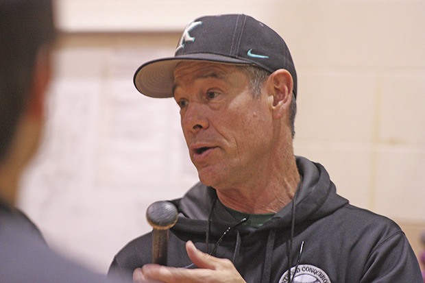 Kentwood coach Mark Zender talks to his players at batting practice on Monday afternoon. The Conquerors are preparing to face Walla Walla in a state Class 4A opener Saturday in Puyallup.