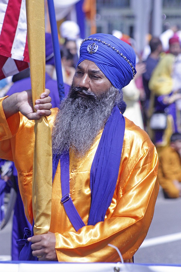 A flag bearer stands proudly at the start of the Khalsa Day Parade in 2015