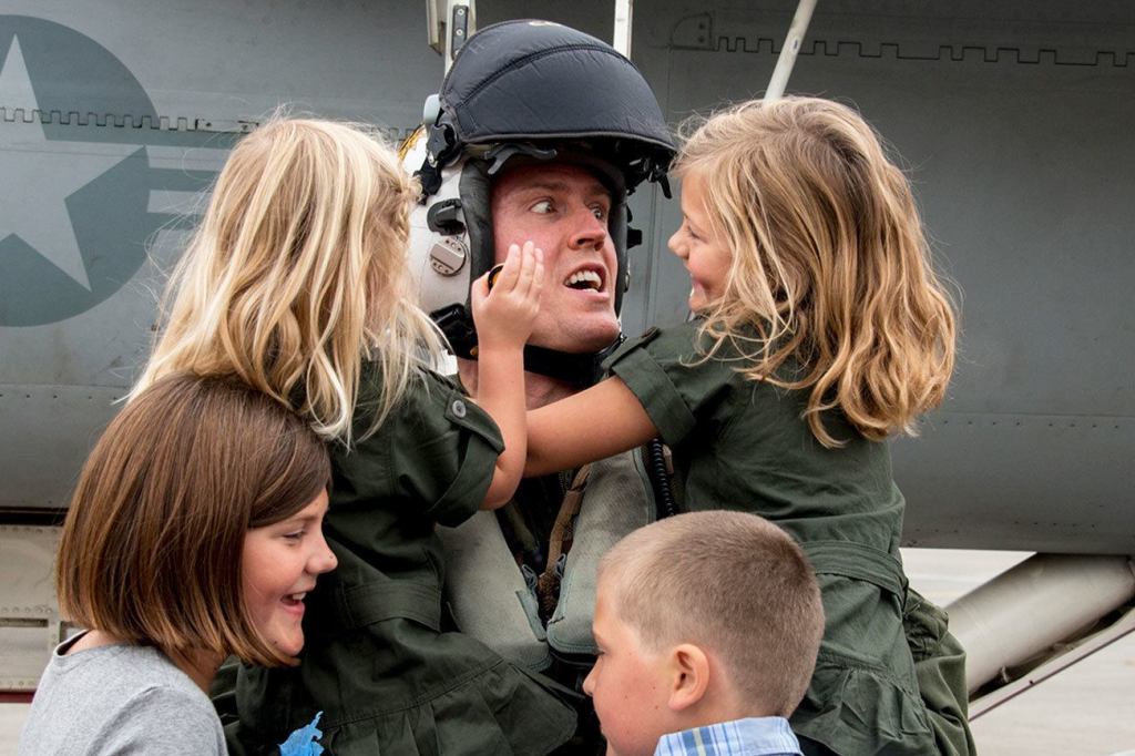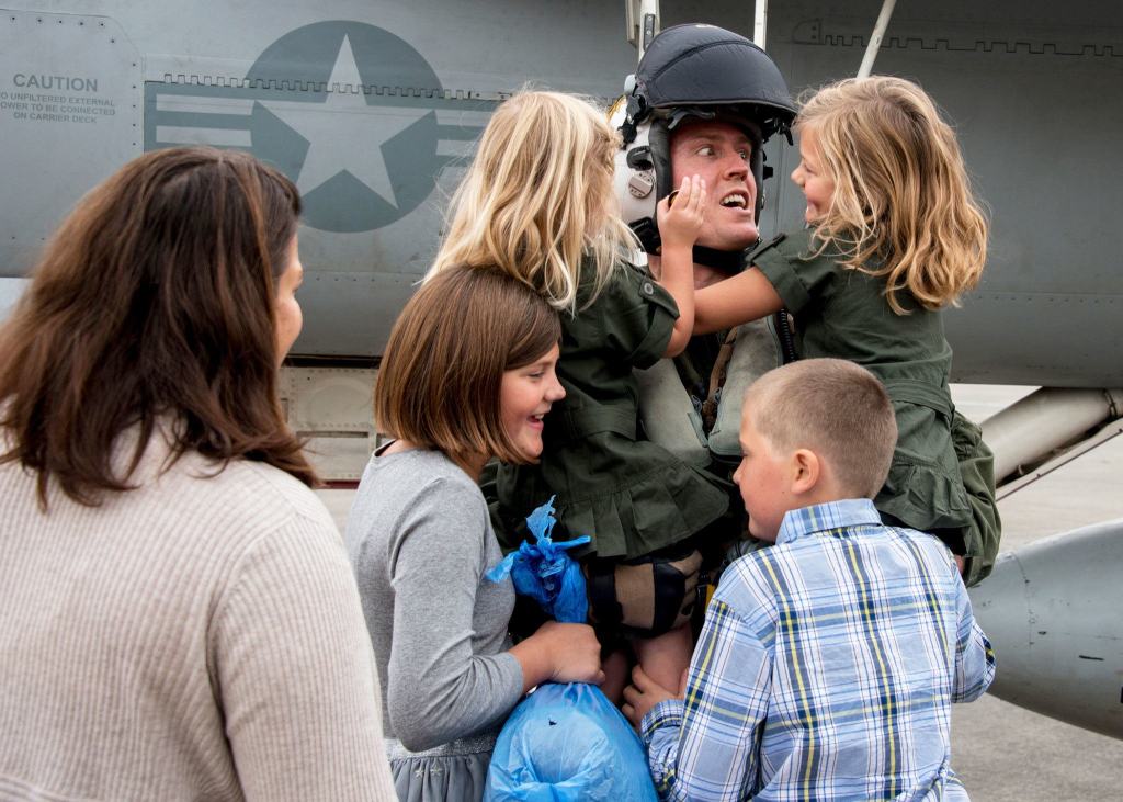 Daniel Cochran, a U.S. Navy Strike Fighter Squadron commanding officer from Kent, greets his family as he returns to Naval Air Facility Atsugi, Japan, from a patrol embarked aboard the Nimitz-class aircraft carrier USS Ronald Reagan last week.