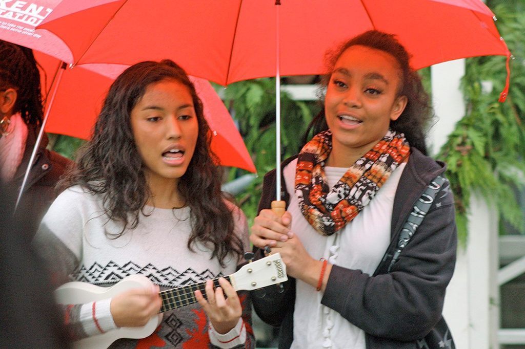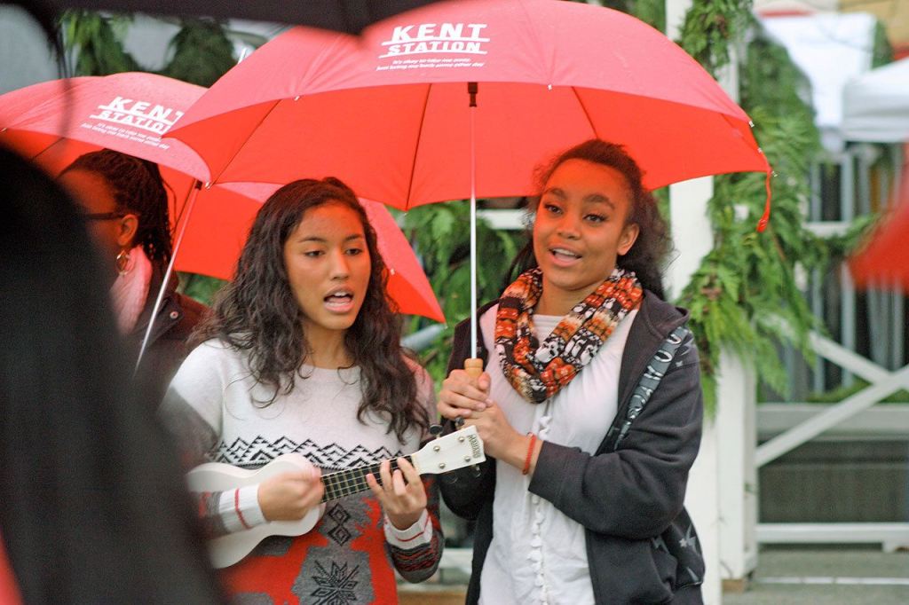 Kayla Palmer, strumming the ukulele, and Cyan Smith of the Kent-Meridian High School Choir sing “Baby, It’s Cold Outside” in front of Santa’s House at Kent Station last Saturday. The senior duet was part of the festivities as families and their children awaited the arrival of Santa Claus. MARK KLAAS, Kent Reporter