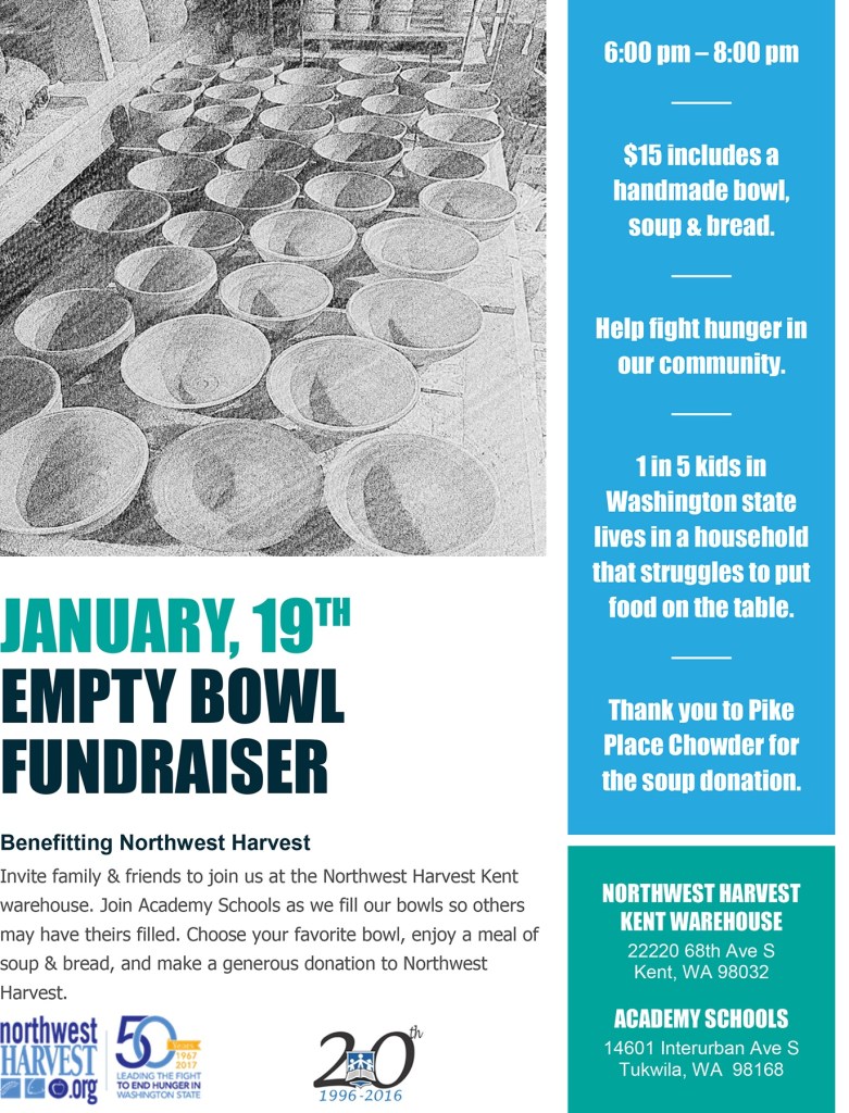 Academy Schools co-hosts an Empty Bowl event at Northwest Harvest’s Kent warehouse on Thursday, Jan. 19, from 6 to 8 p.m.
