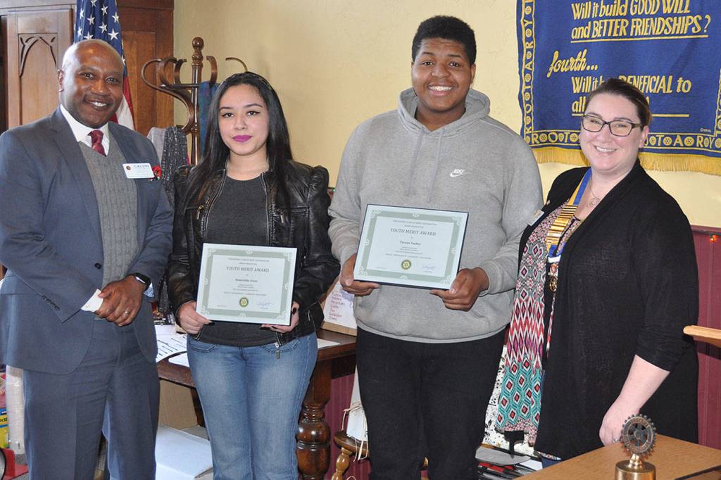 Joining Kent Phoenix Academy’s Esmeralda Arceo and Tyrone Tucker at the award presentation are Kent School District Superintendent Calvin Watts and Rotary Club President Amy Hobson. COURTESY PHOTO, Rotary Club