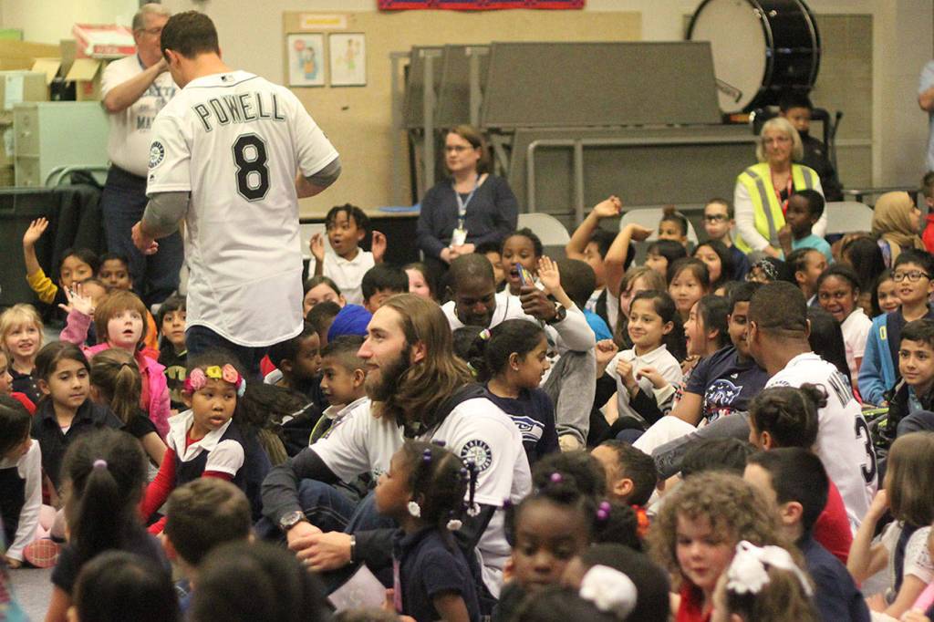 Boog Powell and other Seattle Mariners visit Meadow Ridge Elementary School and mingle with students on May 17, part of the organization’s annual DREAM Team Assembly tour of area schools.