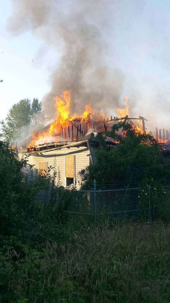 An abandoned house burns on Friday moring in Kent in the 22300 block of Russell Road near the Green River. Courtesy Photo/Puget Sound Fire