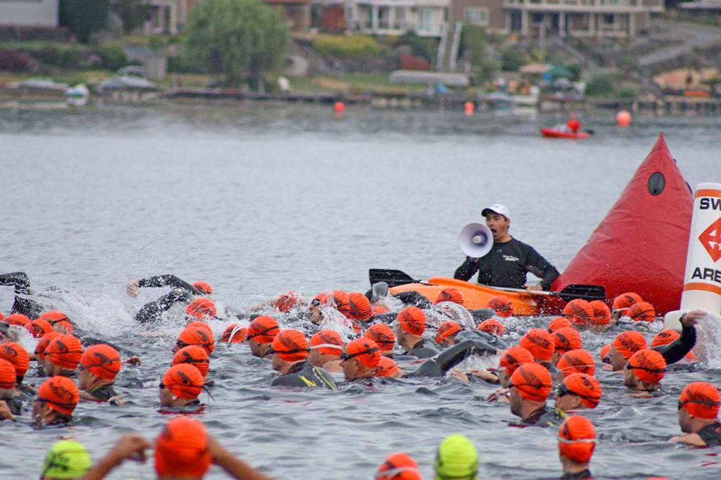 Swimmers in the Olympic division of the Lake Meridian Triathlon start their 1.5-kilometer swim last Saturday morning. More than 520 individuals and more than 20 relay teams competed in the eighth annual event, which includes swimming, biking and running. MARK KLAAS, Kent Reporter