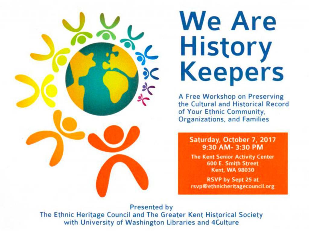 The Greater Kent Historical Society, the Ethnic Heritage Council and the University of Washington Libraries and 4Culture present We are History Keepers, a free workshop on preserving the cultural and historical records of ethnic community organizations and families.