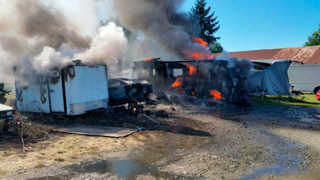 The fire broke out at a private storage yard near the 26500 block of 79th Avenue Southwhen two men were cutting into a car they owned and sparks ignited the vehicle on fire, according to Puget Sound Fire spokesman Keith Kepler. The fire then spread to a utility trailer and an older RV. The cause is considered accidental. All of the items are considered a total loss.