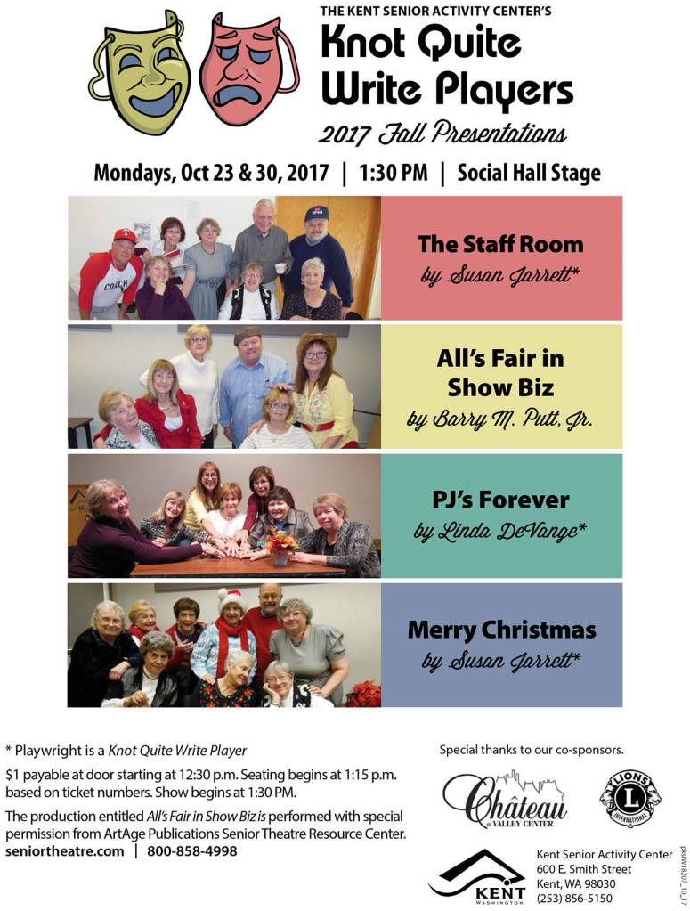 The Kent Senior Activity Center’s theater troupe known as the Knot Quite Write Players presents its fall play lineup Oct. 23 and 30 at 1:30 p.m. on the Social Hall Stage.