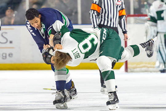 Everett (10-11-1-1) pulled Wolf with under a minute left for an extra attacker. Donovan Neuls knocked down an Everett shot and Volcan sent the loose the puck down the right wing. Volcan chased the puck down and from a sharp angle at the bottom of the right circle hit the empty net as an Everett defenseman dove to try and make the save.