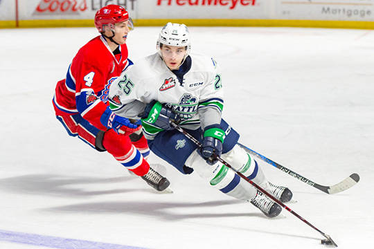 The Chiefs made it 2-0 at 17:51 of the first when a shot by Nolan Reid from the right circle deflected off a T-Birds defenseman and past Seattle goalie Liam Hughes.