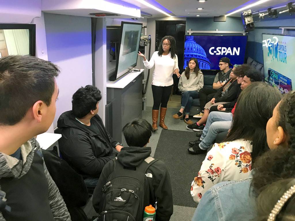 “We’re spreading the gospel of C-SPAN,” said Thueringer, a 1999 K-M graduate, between helping students on how to use the mobile classroom and studio. “It’s nice to see students coming here to the new bus and learning about C-SPAN and what’s available to them.”