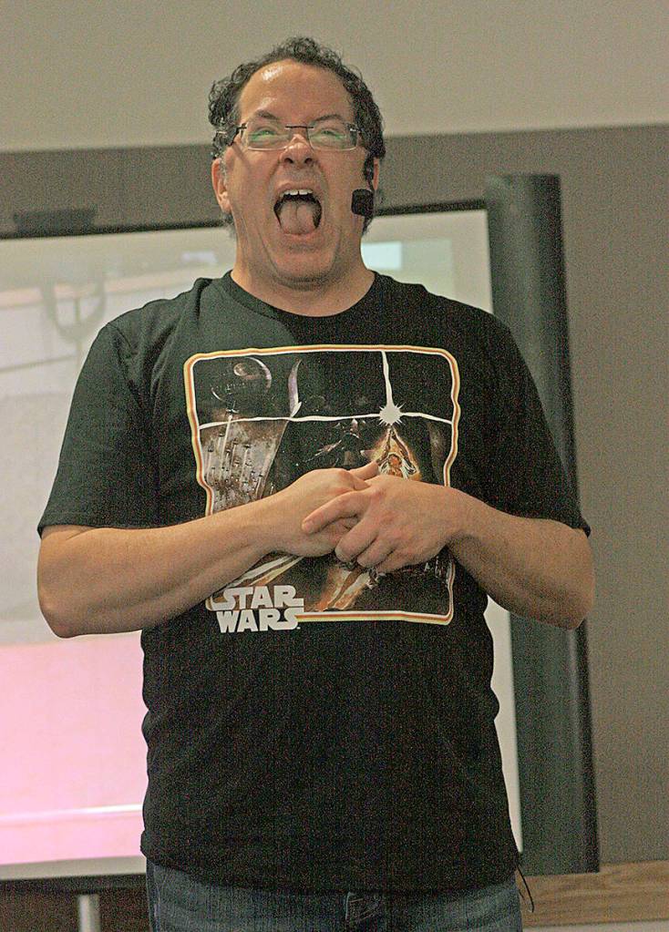 Charlie Williams, “the Noiseguy,” tells the tale of “Toy Wars: a Star Wars Toy Story” at the Kent Library last Friday, part of his May the Fourth Be With You Star Wars Day program. Williams provided a hilarious spin on the story, replete with sound effects for children.