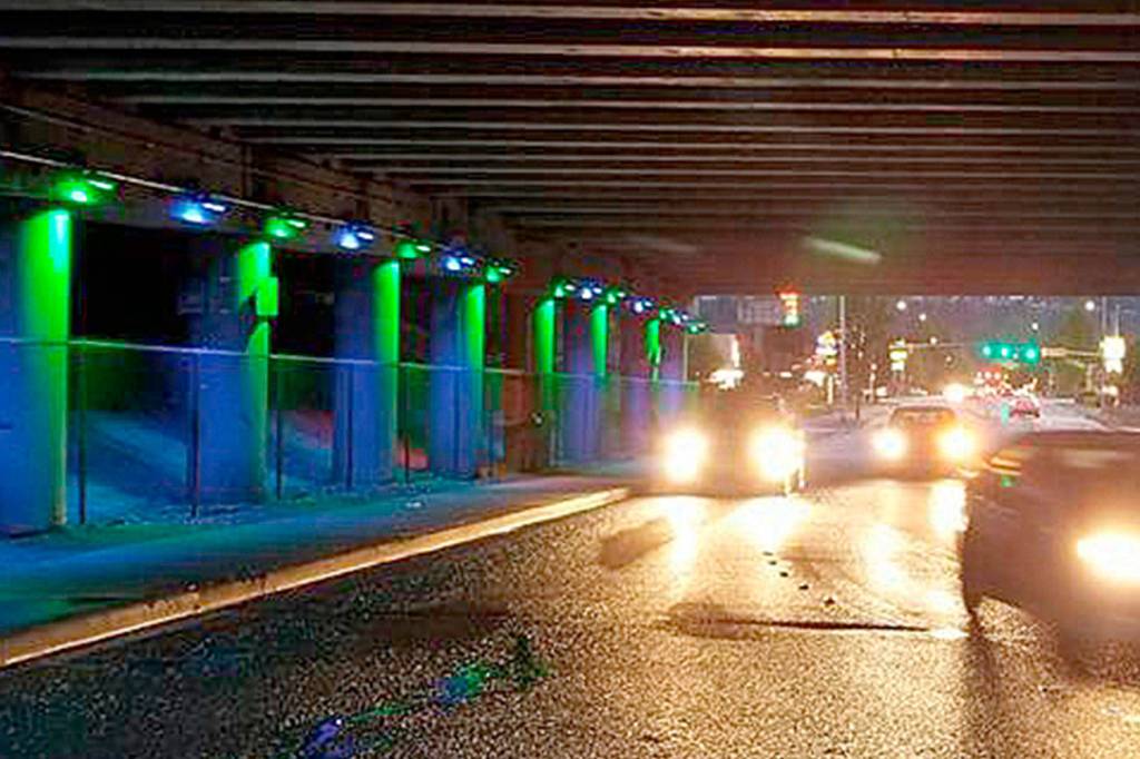 The display features energy-efficient, colored LED architectural lighting under the overpass. The artistic light display is programmable and can be changed by the city to mark special events or holidays.