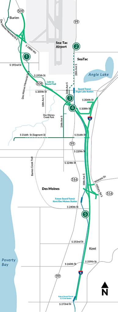 1) The SR 509 alignment will cross over the Lake to Sound Trail near South 200th St. 2) The project design accommodates the Port of Seattle’s concept for a South Airport Expressway from SR 509 to Sea-Tac Airport. 3) 28th/24th Avenue South connection in SeaTac. 4) All lanes on the new portion of SR 509 will be tolled using one electronic toll point. 5) State DOT is working closely with Sound Transit as both agencies work to build new major infrastructure projects in the area. COURTESY GRAPHIC, State DOT