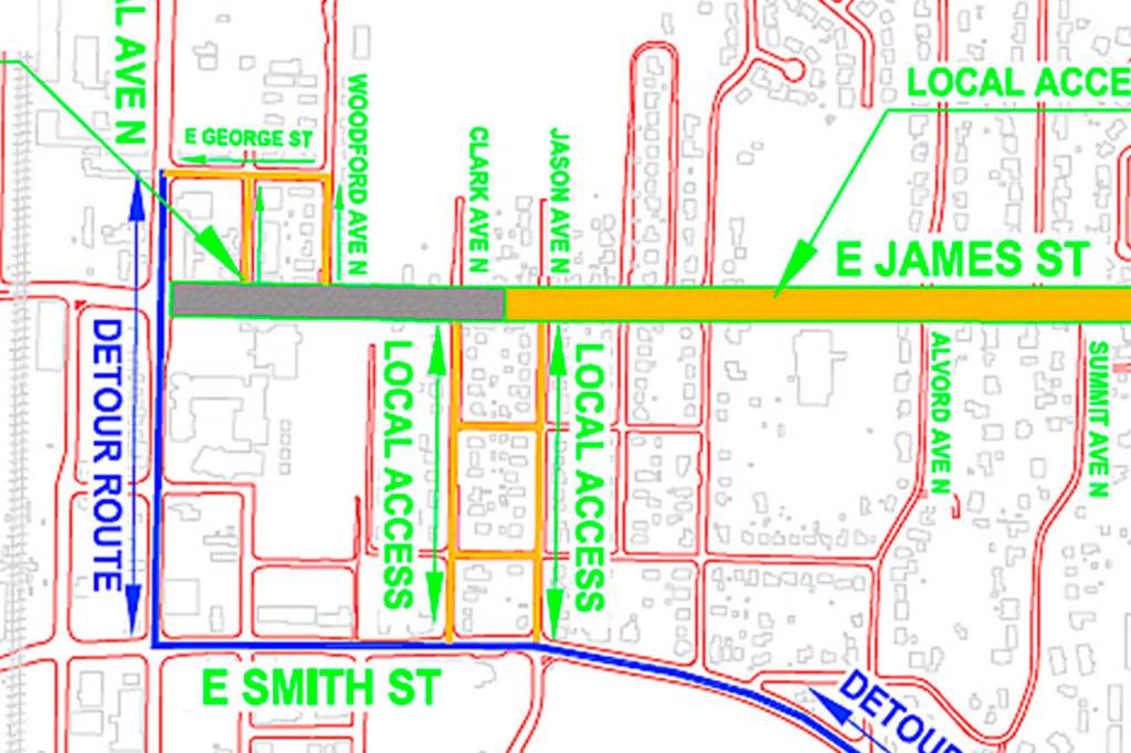 Crews will place concrete 8 inches deep along James Street between Central Avenue North and Clark/Jason Avenue North. The City Council awarded the low bid on June 5 to Kiewit for $1.89 million. Funds from the city’s business and occupation tax will pay for the work.