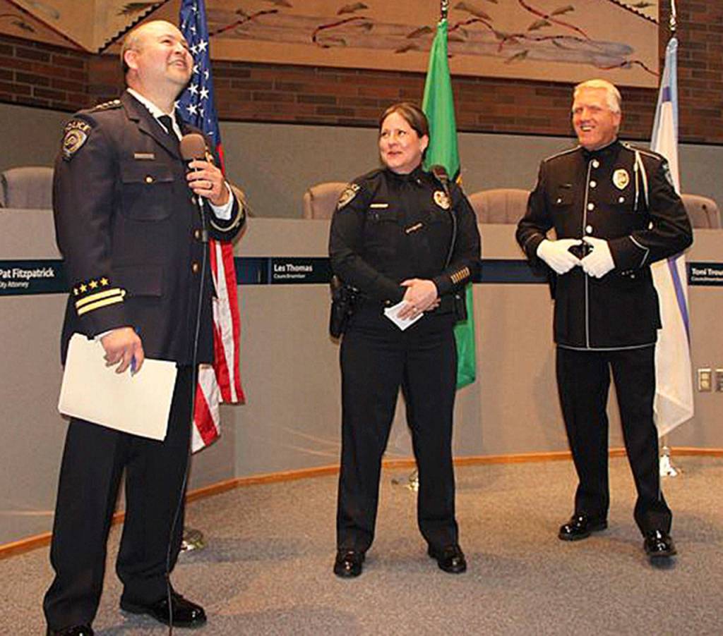 Officer Steve Holt retired after 30 years with the Kent Police and 32 years of overall service. Cmdr. Tracey Padilla, the wife of Kent Police Chief Rafael Padilla, retired after 28 years with the force. Holt and Padilla were honored last week with a retirement party at City Hall.
