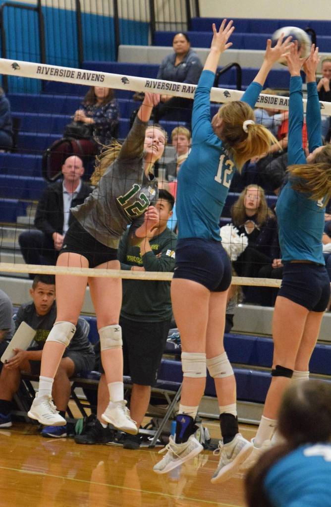 Kentridge High’s Kate Wick spikes the ball over the reach of Auburn Riverside’s Lanae Wohlmacher (12) and Camden Heilborn (3) during a North Puget Sound League volleyball match Tuesday night.