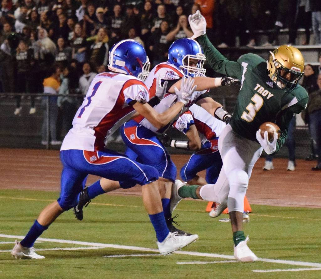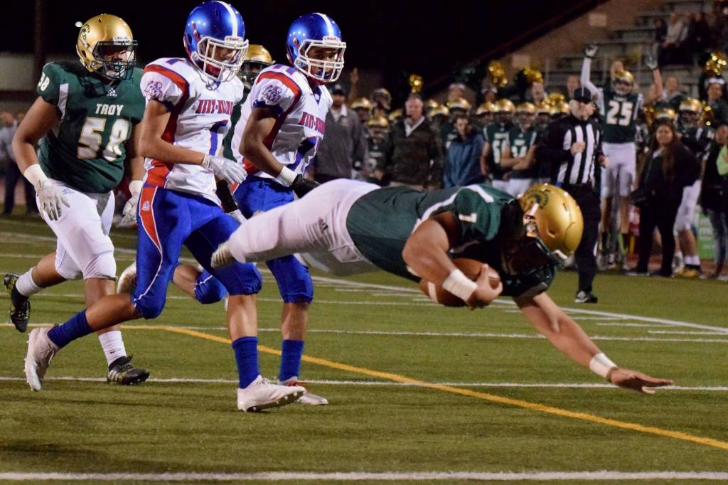 Auburn quarterback Calvin Liulamaga dives into the end zone, scoring one of his two first-half touchdowns against Kent-Meridian on Friday night. Pursuing are the Royals’ Ronald Wilson, left, and Nate Jones. Liulamaga accounted for four TDs as the Trojans prevailed 43-35 in a North Puget Sound League interdivisional game. RACHEL CIAMPI, Auburn Reporter
