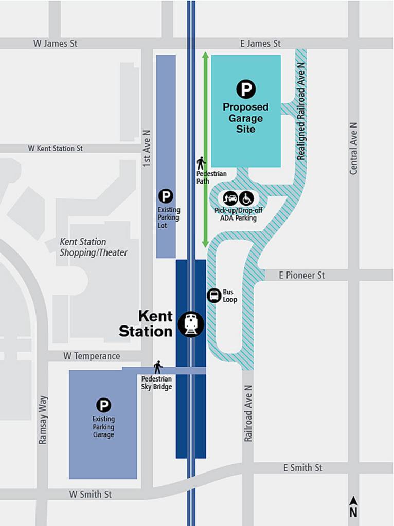 In November 2017 the Sound Transit Board identified a preferred package of access improvements for Kent Station, including a new parking garage at East James Street and Railroad Avenue North, along with pedestrian, bicycle and transit improvements.