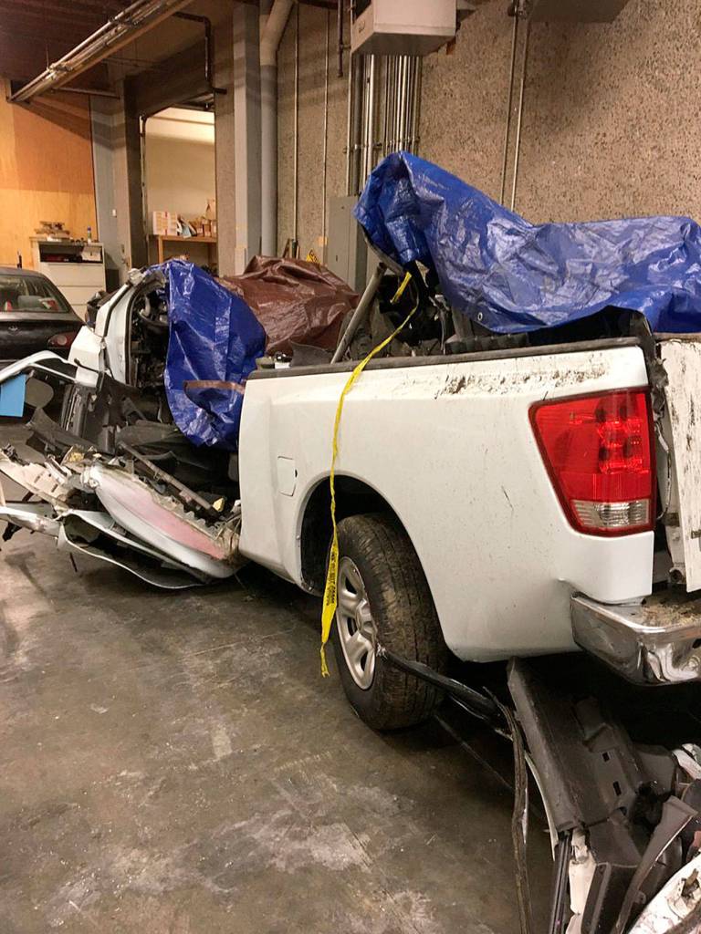 During the rollover, the Nissan Titan’s roof struck the southbound I-5 overpass bridge pillar causing the roof to crush inwards onto the four passengers, one in the front passenger seat and three in the rear seat. The pickup then rotated around the backside of the pillar coming to a final rest facing westbound on its wheels. All four men died at the scene.