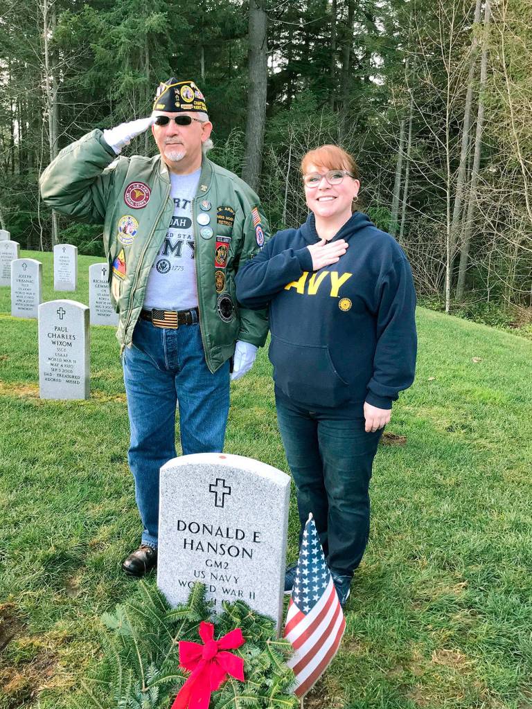 U.S. Army veterans Chriss Moen and Debi Lovelace, a Navy mother, salute after laying a wreath for departed World War II Navy veteran Donald Hanson at Tahoma National Cemetery on Saturday.