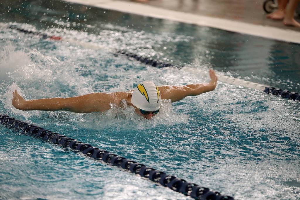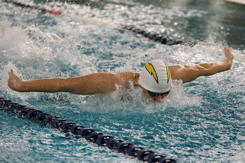 Kentridge senior Milo Andersen swims the butterfly leg of his 200-yard individual medley during a North Puget Sound League Cascade Division meet against Kent-Meridian last Friday. Andersen and the Chargers rolled to a 122-24 victory, clinching their sixth straight division title.
