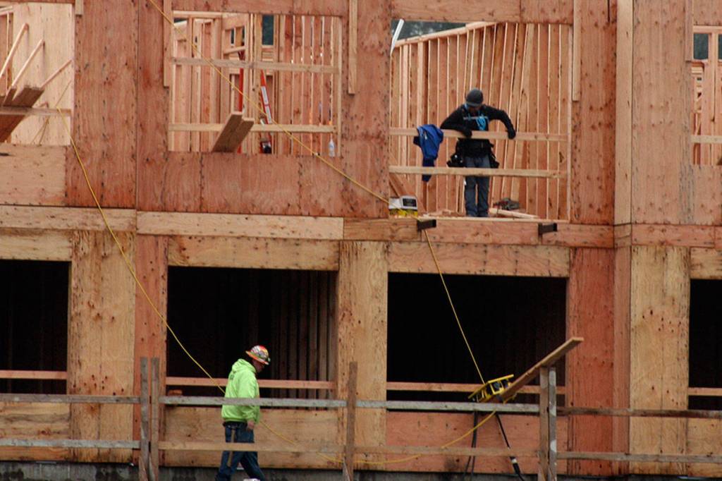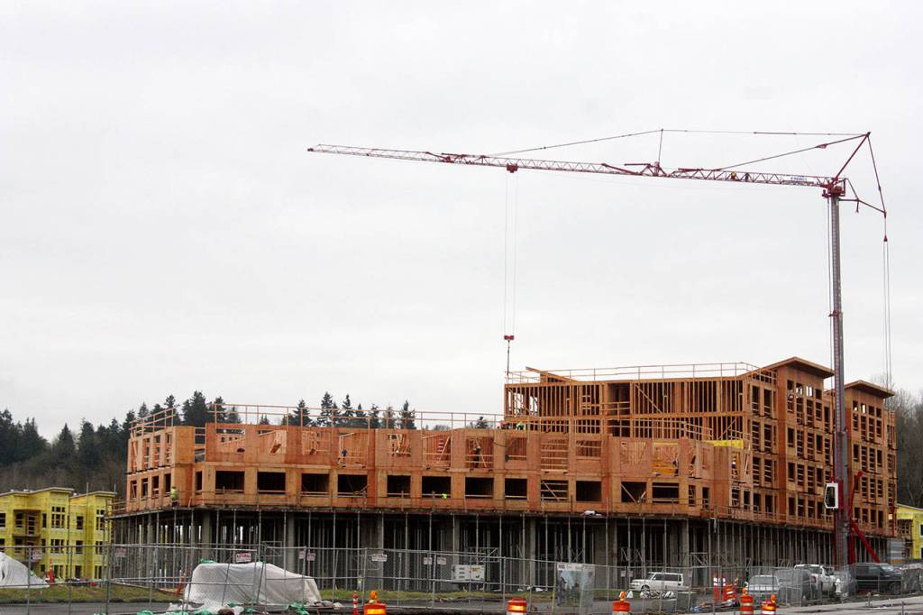 Crews continue to work in Kent on phase I of the new upscale Marquee on Meeker Apartments under construction on the former city-owned Riverbend par 3 golf course.