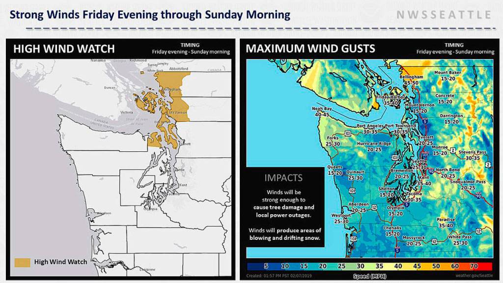 The National Weather Service predicts a windstorm will join the snowstorm on Friday evening through Sunday morning, including speeds of 35 to 40 mph in Kent.