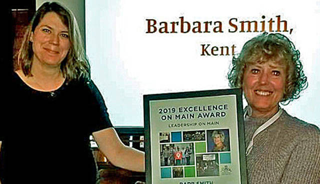 Barb Smith, retiring executive director of the Kent Downtown Partnership, received the Washington State Main Street Program’s 2019 Leadership on Main Award.