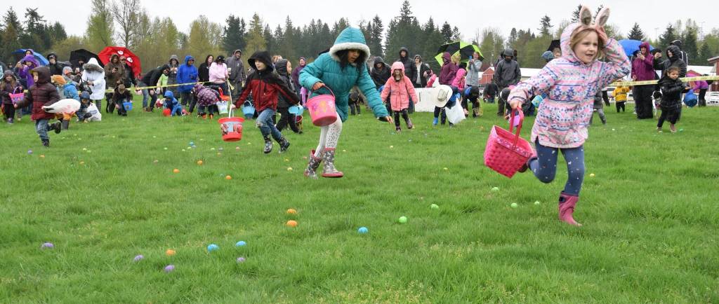 Children of all ages scrambled to fill their baskets and buckets despite a damp, wet day.
